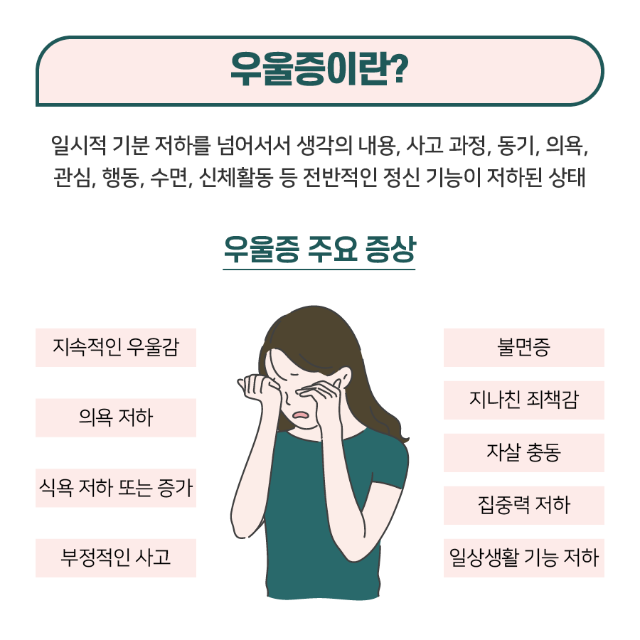 우울증 증상 첫번째, 하루종일 또는 반나절 이상 우울한 기분이 지속되는 경우가 잦아지며, 만사가 귀찮고 다른 사람들과의 관계에서도 즐거움을 찾지 못하는 우울한 기분이 우울증의 증상일 수 있어요. 이런 시기에는 자신의 삶에 대한 생각이 많아지고 우울한 기분을 계속해서 느끼게 돼요. 우울감을 느끼는 사람들은 사회 등에서 기존과는 다른 생활패턴을 보이거나 자신의 역할을 제대로 수행하지 못하는 경우가 많아요.