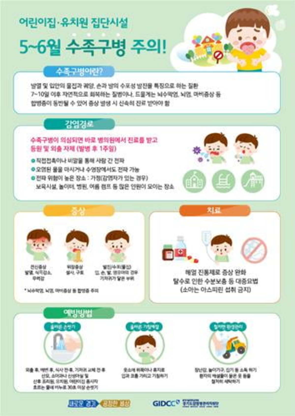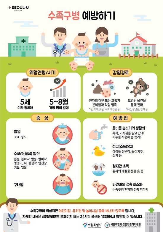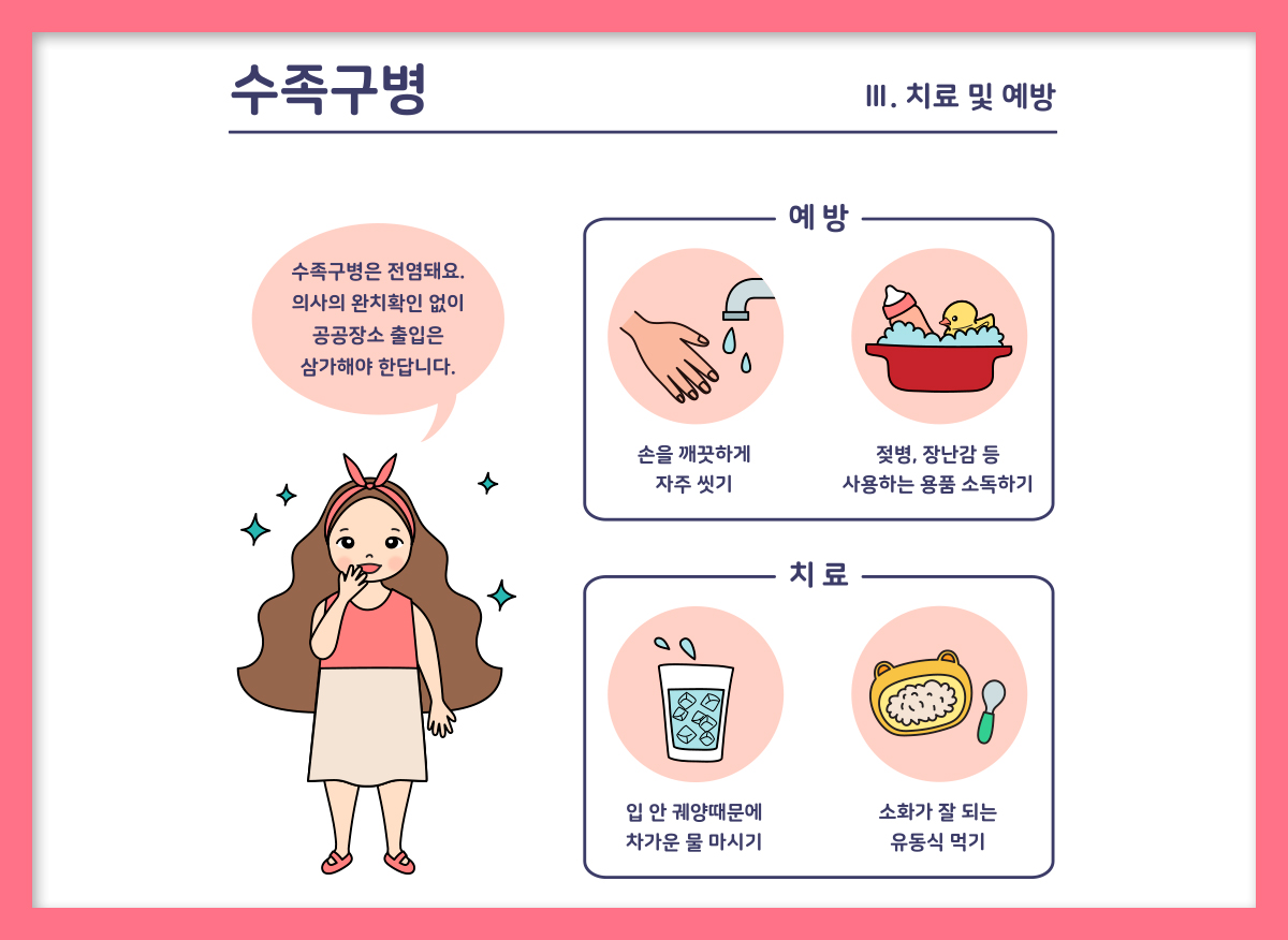 현재 수족구병과 연관된 백신은 없어요. 따라서 수족구병을 예방하려면 영유아들이 손씻기를 생활화하도록 지도하는 것이 최선인데요. 장난감, 놀이기구, 집기 등을 소독해 청결을 유지하는 것도 중요해요. 그리고, 수족구병은 비말을 통해 전염될 수 있는 질환인데요. 발병 첫 주에 가장 전염성이크지만, 증상이 사라진 후에도 분변 등을 통해 수 주간 계속하여 바이러스를 전염시킬 수 있어요. 전염성이 강력한 시기에는 자가 격리하도록 하고 이후에도 분변 관리나 손 씻기 등 위생관리를 철저히 해야 해요.